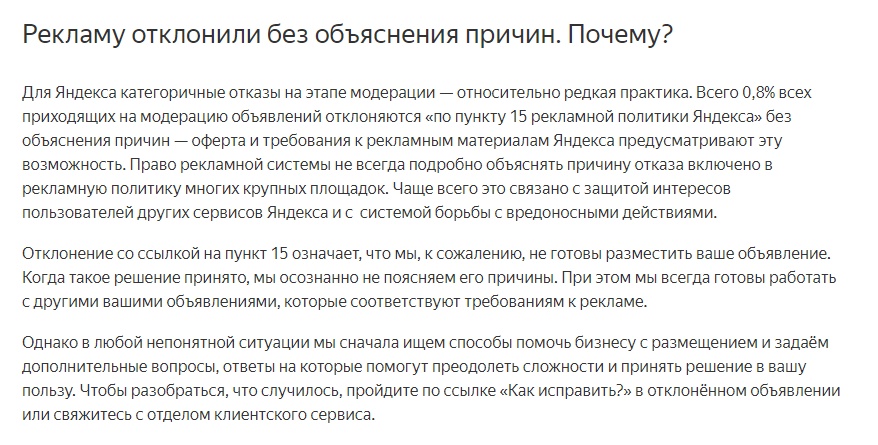 Но несколько успешных историй все-таки есть. Например, в «Клубе Директа» пользователь пожаловался на то, что его кампанию отклонили по 15 пункту после предварительного согласования. Представители «Директа» извинились и приняли объявления к показам: