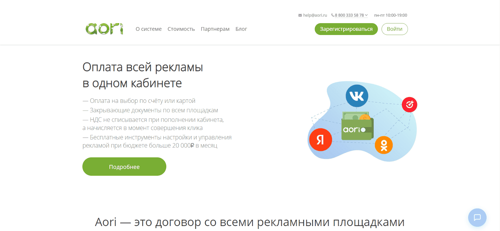 Сервис предлагает единый рекламный кабинет для ВК, Яндекса, Одноклассников и MyTarget. Aori также предоставляет услуги по настройке и оптимизации, создании сайтов, анализу посадочных страниц.