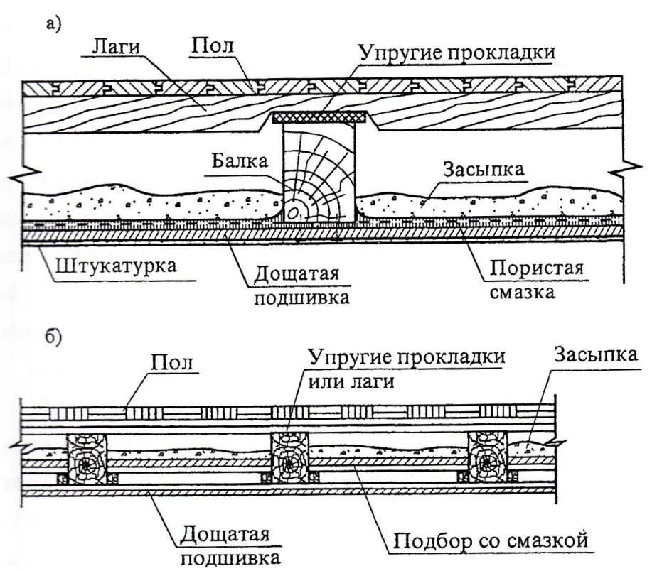 2. Конструкция перекрытия по деревянным балкам. а – чистый пол из шпунтованных досок; б – паркетный пол