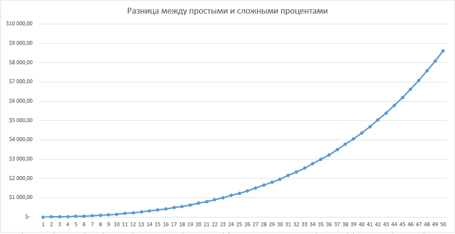 Чем больше проходит времени, тем большим становится разрыв между депозитом с простыми и сложными процентами. К 50 году разница между этими вариантами достигнет $8619,38.