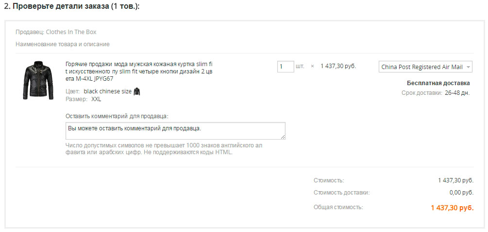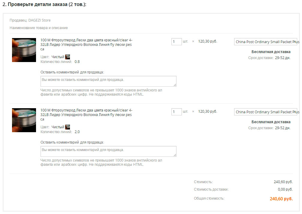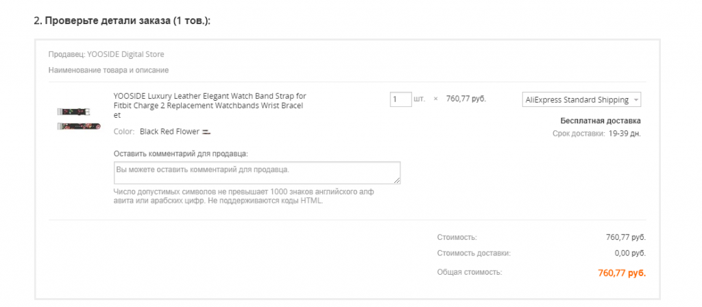 Также здесь имеется форма, в которой можно оставить комментарий для продавца. Например, если не имеется возможности выбора цвета товара, можно написать в комментарии предпочитаемый Вами цвет и так далее. При оформлении заказа сразу на несколько товаров из корзины, у каждого товара это поле будет отдельное.