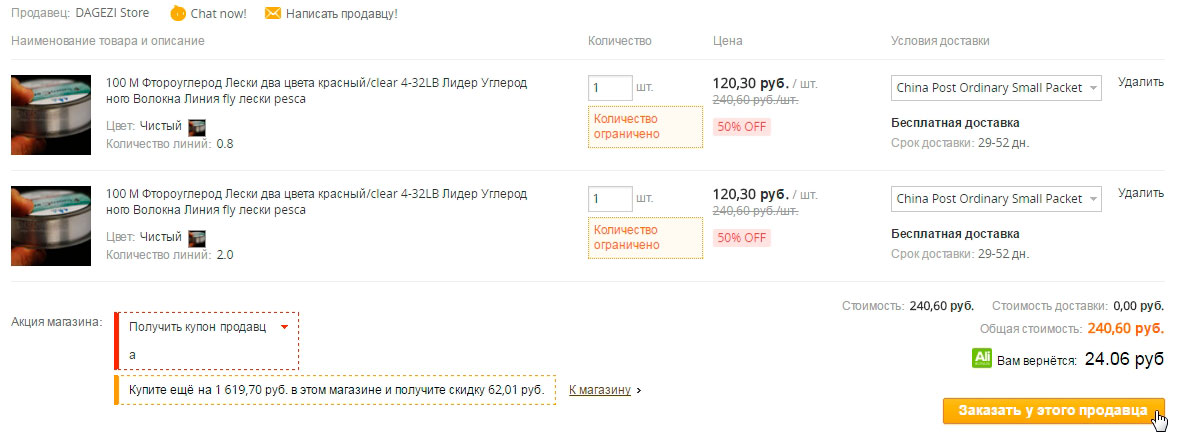 Если Вы перед покупкой добавляете товар в корзину, то зайдите в нее. В каждом окне добавленного товара имеется кнопка «Заказать у этого продавца». Нажмите на нее, чтобы совершить покупку. Кстати, если Вы добавили в корзину сразу несколько товаров одного продавца, то из корзины их можно оплатить вместе.
