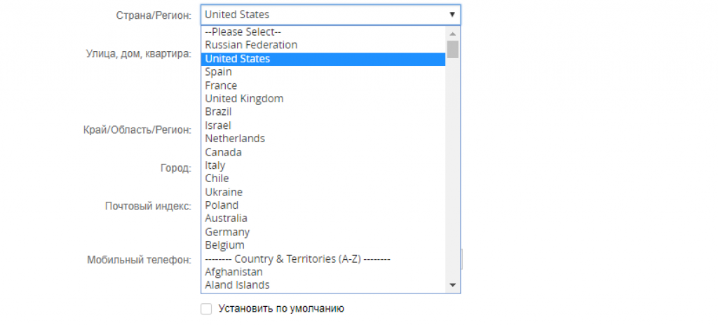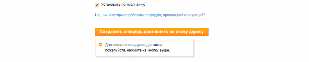 Шаг 6. Если вы установите галочку в чекбокс Установить по умолчанию, то данный адрес и параметры получателя сохранятся в кабинете в качестве основных и выше посылки будут приходить на этот адрес и на это имя, если не будет указано другого на стадии оформления заказа;