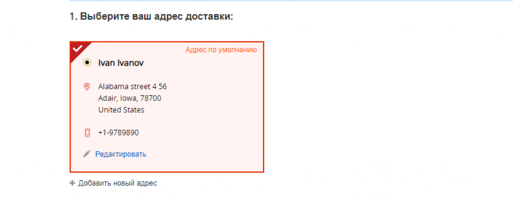 Посылка по умолчанию пойдёт на адрес, который мы указывали в 8 пункте (можете на этом этапе добавить новый адрес);
