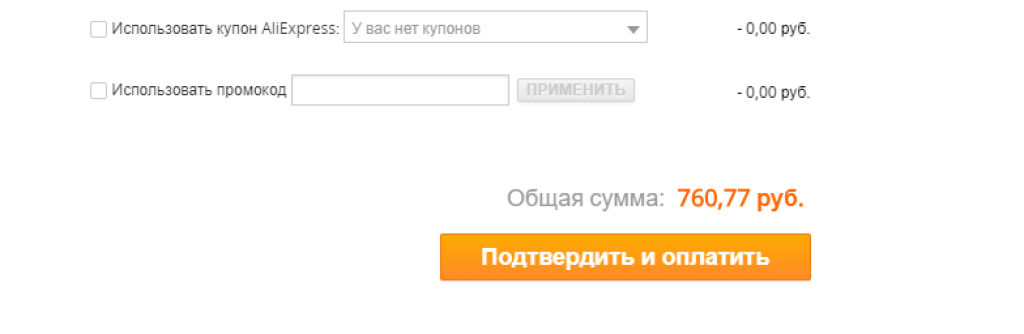 Если у Вас имеется подходящий купон на скидку в выбранном магазине, то он автоматически будет применен. После этого следует подтвердить заказ на АлиЭкспресс, нажав на кнопку «Подтвердить и оплатить».