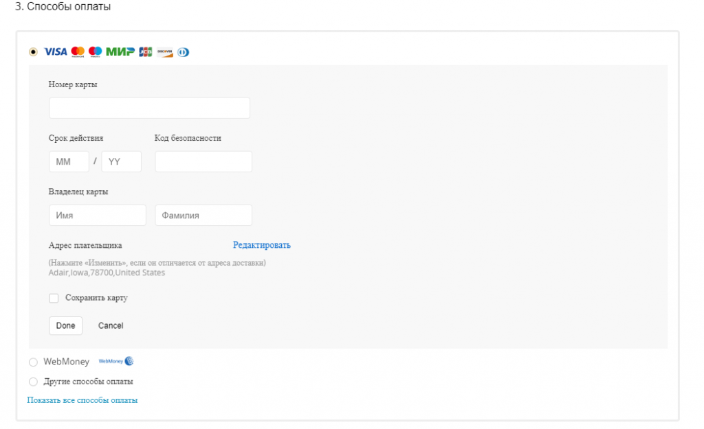 15. Добавляем любой удобный способ оплаты (банковскую карту или электронный кошелёк, если нет КИВИ, см. статью не проходит оплата на Алиэкспресс).