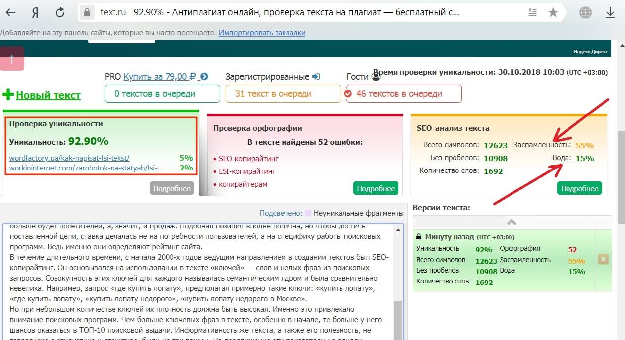 Отсутствие спама, то есть перенасыщения текста повторяющимися словами и фразами. Как вы видите, та же программа TEXT.ru, проверив текст на уникальность, покажет и процент воды в нем. Повторы вредят вообще любому контенту, а в SEO текстах они еще часто связаны с переизбытком ключей.