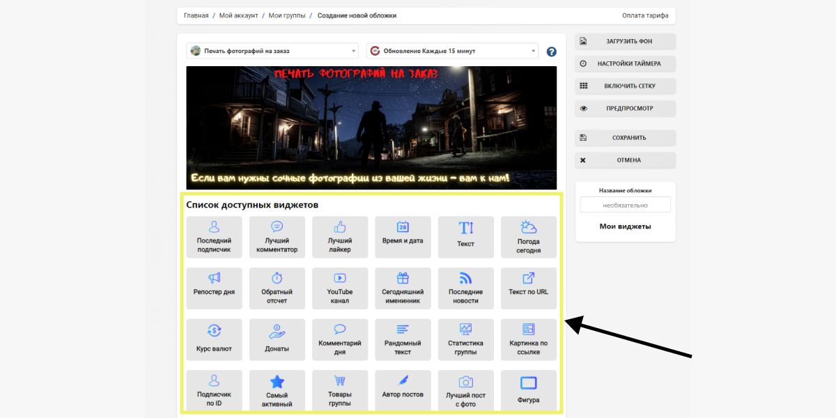 После того как вы установили разметку можно приступать к установке виджетов. Для этого жмем в меню слева уже знакомую кнопку Добавить виджет. И из выпадающего списка выбираем нужный. Для примера возьмем виджет подписчики. Жмем кнопку добавить и вуаля он у вас на обложке. Каждый виджет имеет свои настройки для того что бы посмотреть их жмем на виджет и снизу будут все настройки. Настраиваем как вам нужно и все будет работать.