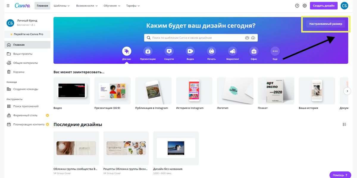 Мы заходи в сервис Canva на главную страницу и в правом верхнем углу, нажимаем на кнопку «Настраиваемые размеры» и вводим туда размеры нашего изображения (1080*1920) и нажимаем на кнопку «Создать дизайн»: