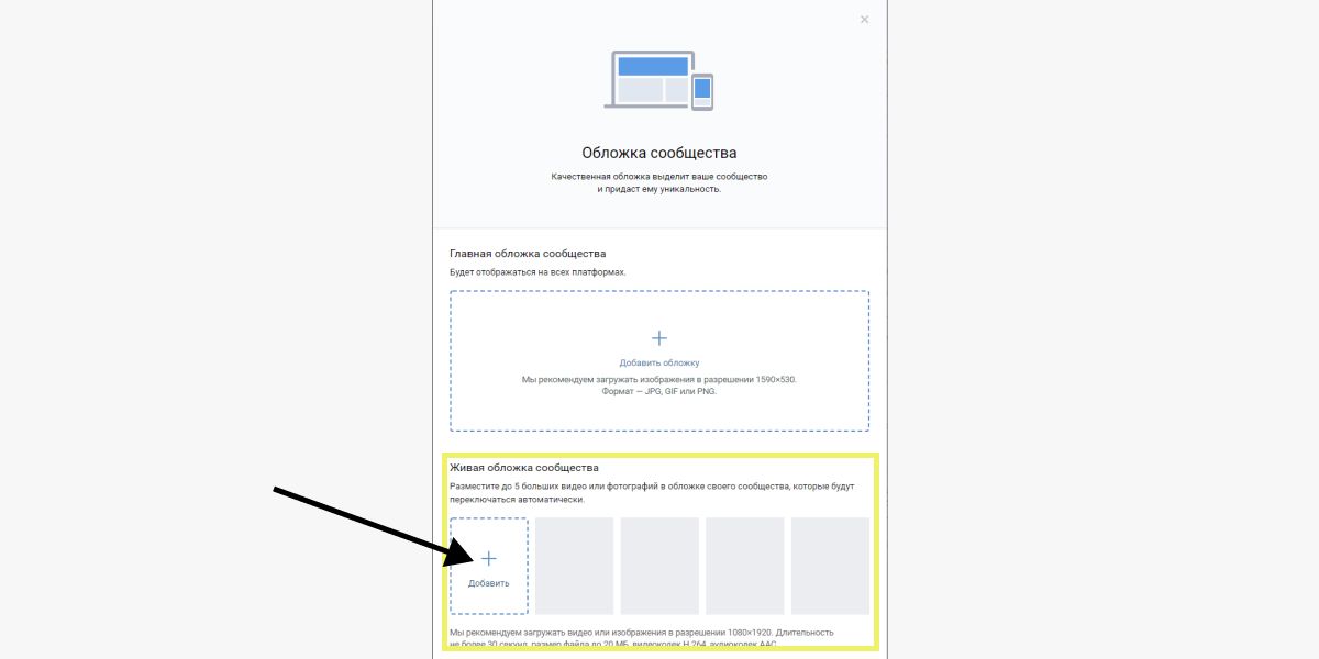 - В «Основной информации» находите «Обложка сообщества — добавить». Нажав на эту надпись перед вами откроется окно с блоками для загрузки главной обложки и 5 картинок или видео для живой обложки, как представлено на скриншоте.