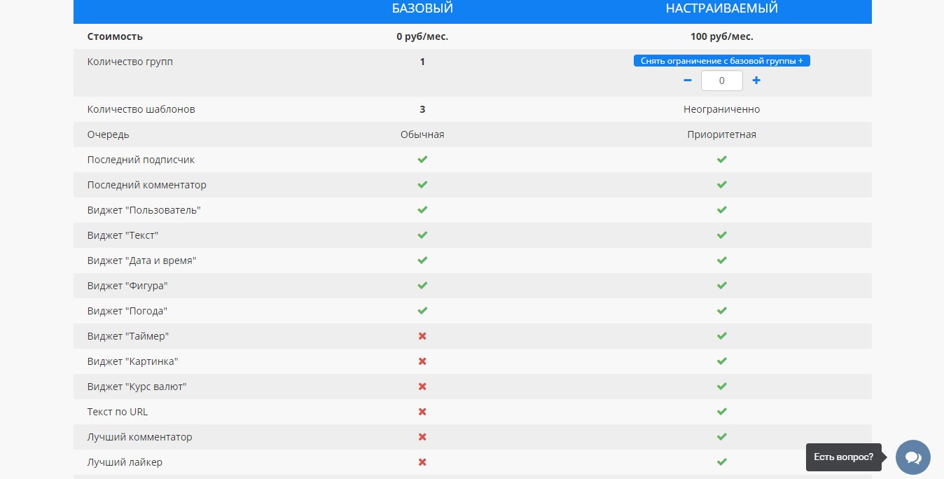 Для виджетов тоже действуют ограничения. На бесплатном тарифе недоступны:
