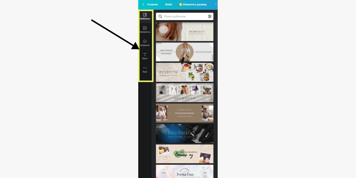 Используйте панель инструментов слева, чтобы найти готовые шаблоны, разные элементы и эффекты.
