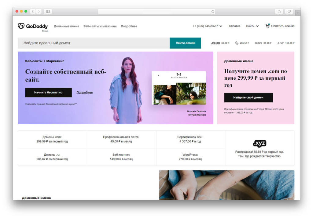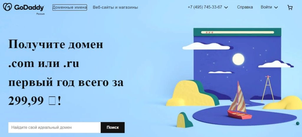 Регистратор доменов Godaddy весьма популярен за свою стабильность. Размещение серверов в самых технически развитых регионах мира делает работу с компанией надежной. Имеются услуги хостинга.