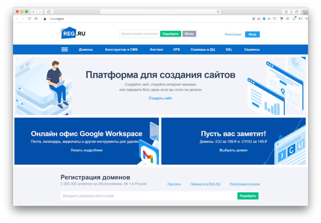 Компания Reg.ru существует с 2006 года и аккредитована ICANN («Корпорация по управлению доменными именами и IP-адресами»). Платформа специализируется на регистрации и переносе доменных имен, а так же предоставляет хостинги. Охватывает более 30% российского рынка пользователей. Имеет бесплатный DNS сервер. Большой выбор доменных зон — 750 вариантов, включая международные площадки. При покупке домена есть возможность попробовать Google Workspace (1 месяц), а так же получить 2 месяца хостинга бесплатно. Имеет очень понятный и удобный интерфейс. Этот регистратор рекомендован и сотрудничает с Тильдой.