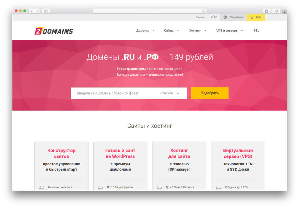 2DOMAINS — аккредитованный регистратор доменов. Официальным поставщиком доменных имен данной площадки является Reg.ru. Это отличная платформа с низкими ценами, благодаря политике компании, которая нацелена на большие обороты. Достаточно легко ориентироваться по сайту: тематические зоны разделены на 30 категорий. Есть функция уведомления об окончании срока действия домена. Сервис предоставляет бесплатно DNS-серверы для подключения домена. В дополнение к покупке площадка предлагает бонусы: при приобретении домена и хостинга — 2 месяца хостинга в подарок. Это самый бюджетный вариант из популярных регистраторов.
