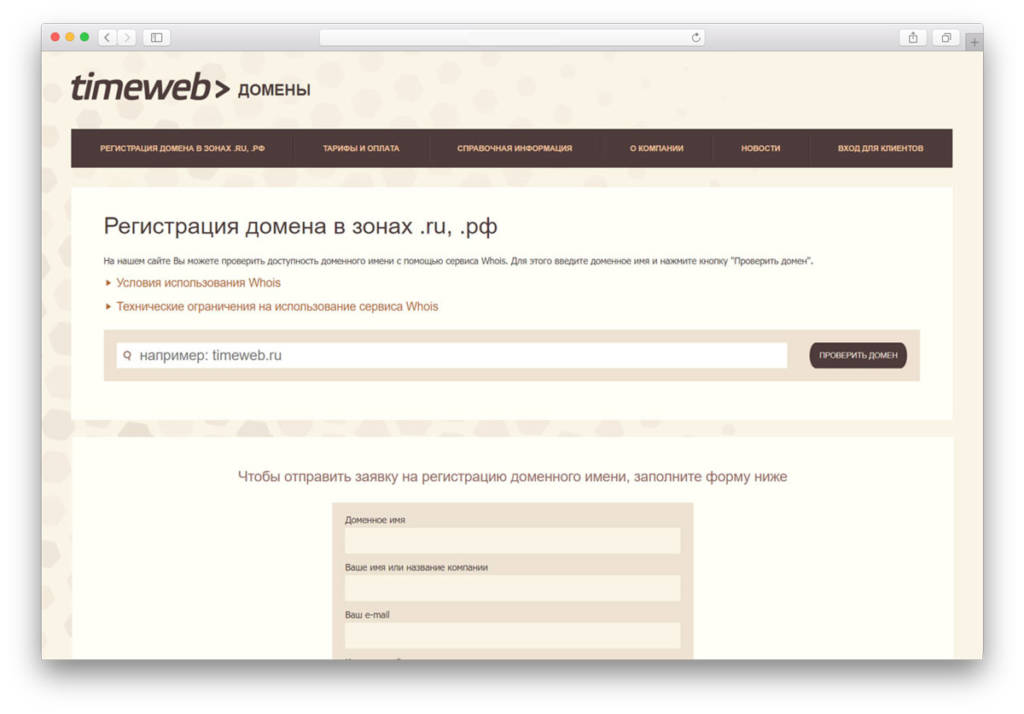 Компания TIMEWEB на рынке обслуживания сайтов существует с 2006 года. Является аккредитованным регистратором доменов .ru, .рф. Она входит в топ-10 самых лучших площадок по России. Сервис предоставляет услуги хостинга, регистрации и переноса доменов, имеется подключение SSL и конструктор сайтов. Содержит более 350 доменных зон: тематические, национальные, географические, международные. Регистратор предлагает при покупке доменного имени бесплатное управление DNS и доменами. Удобная панель администрирования. Высокий уровень сервиса и круглосуточная поддержка.