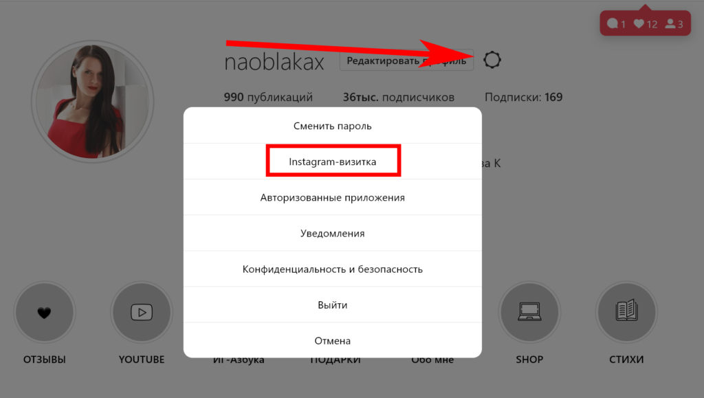 - Нужно войти в свой профиль, нажать «Instagram-визитка» в выпадающем меню в правом верхнем углу;