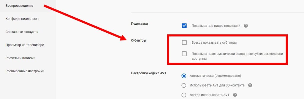 - При отсутствии такой кнопки войдите в Настройки Ютуб и перейдите в секцию Субтитры.