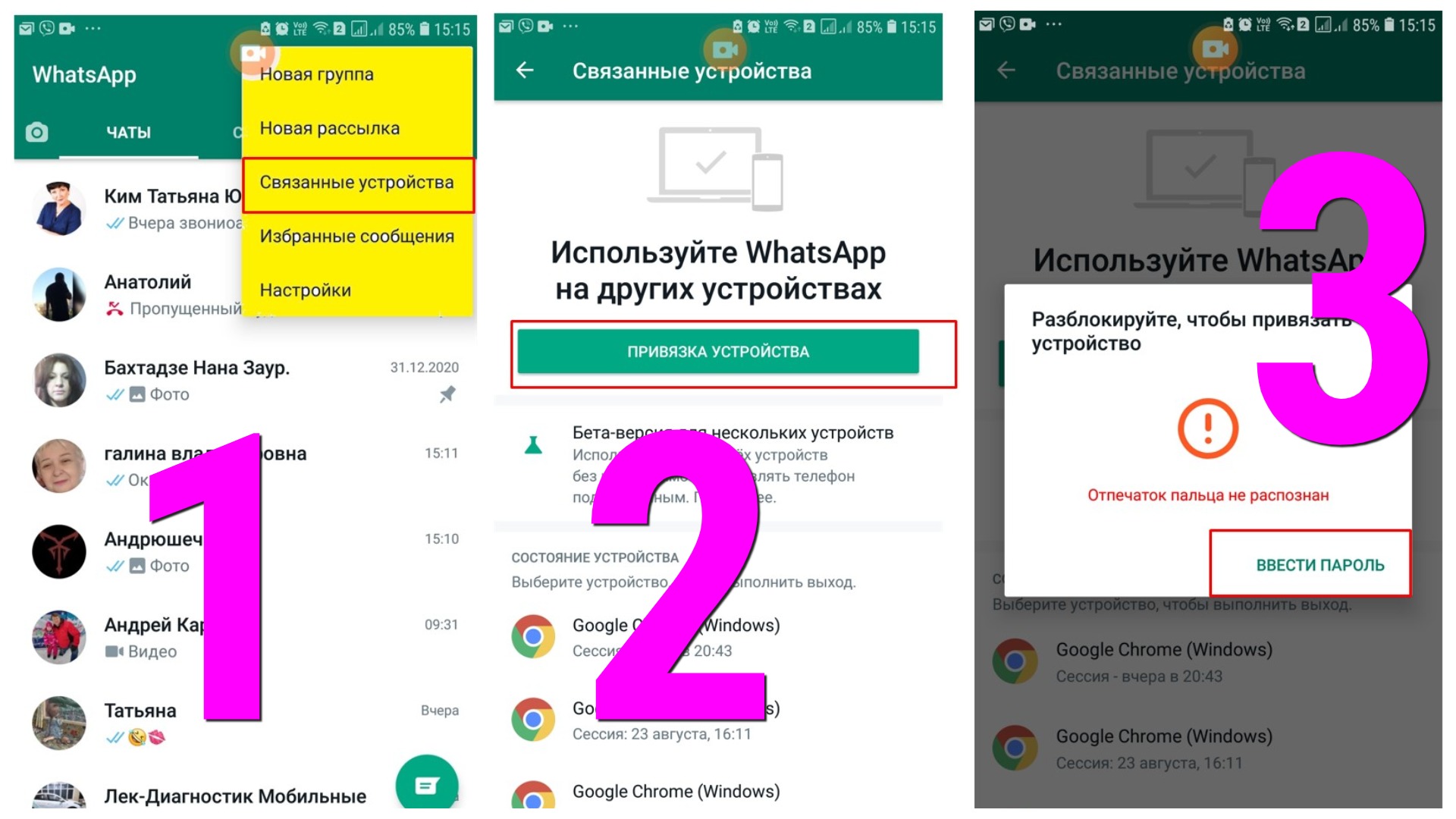 Далее на экране появиться QR-код. Заходите в смартфоне в ватсап, нажимаете в верхнем правом углу на 3 точки и далее ищете “связанные устройства”. Жмете “привязка устройства”, если у вас есть пароль, то придется его ввести, появиться окно сканирования QR-кода, который вы видели на экране ПК.