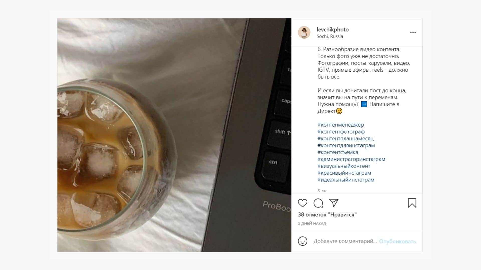 Теперь выкладывайте пост поставив у него 30 высокочастотных хештегов по тематике. Можно добавлять теги в текст публикации, а можно в комментарии. Так, вы наберёте первые оценки.