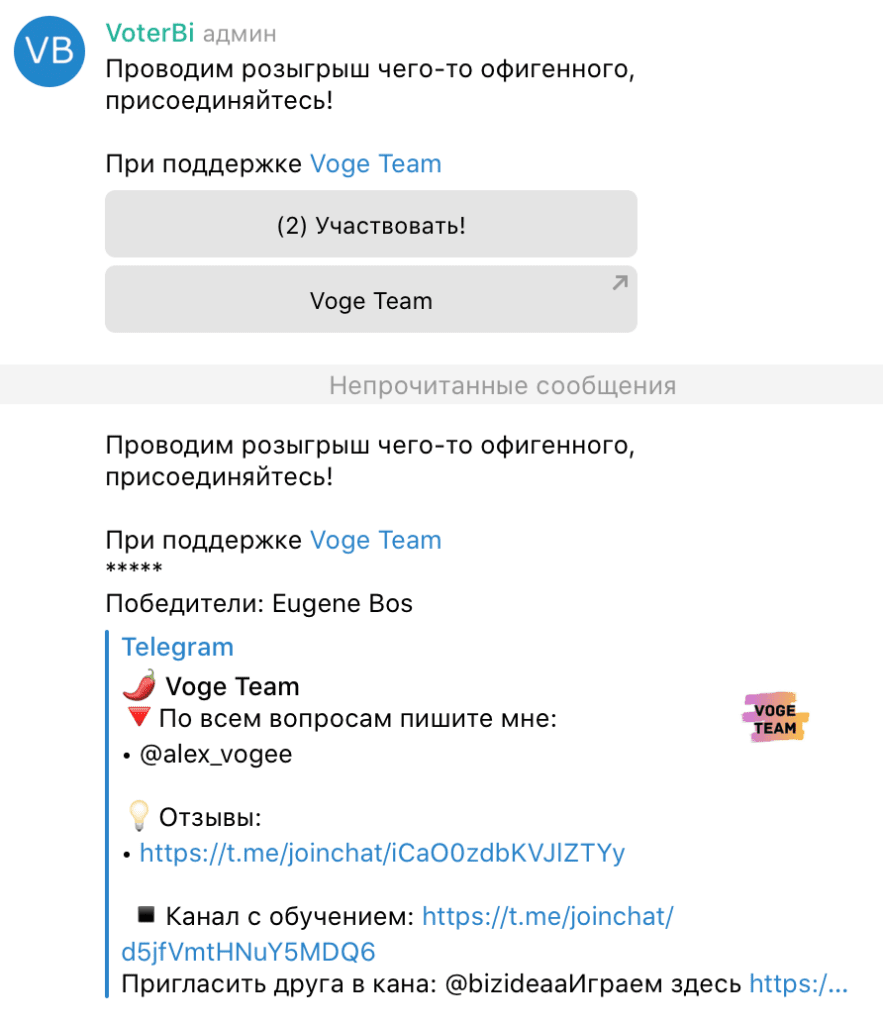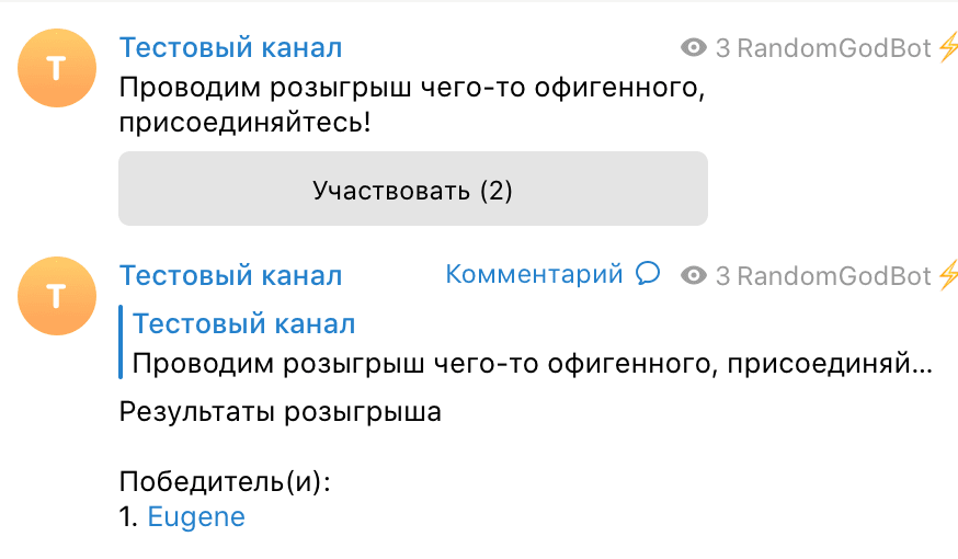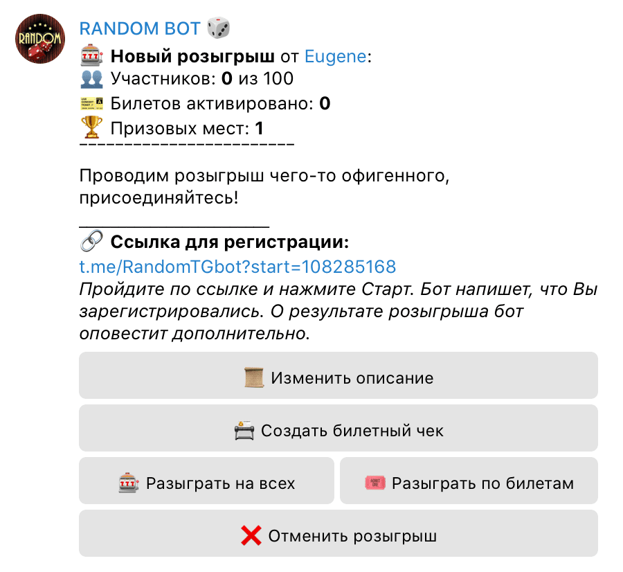 Проводит розыгрыш, для того чтобы присоединиться к нему достаточно опубликовать ссылку в канал или группу, бота добавлять в группу не нужно