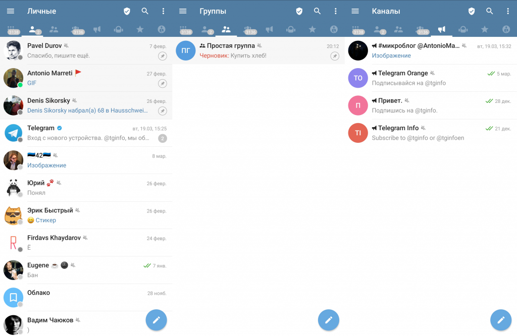 После появления русского языка в Telegram у активных пользователей мессенджера осталось одно желание (не считая групповых и видео звонков) — это разделение чатов по их типу (личные сообщения, группы, каналы, боты).