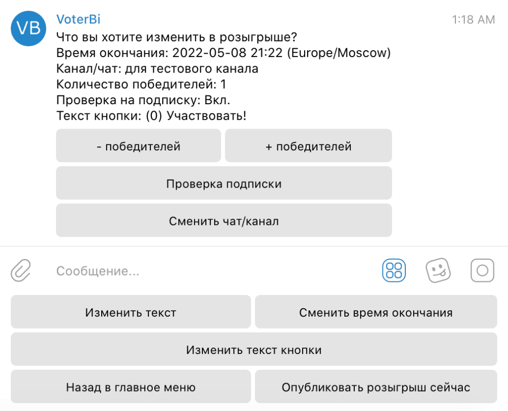Можно сделать обязательным подписку на заданные каналы для участия в розыгрыше, изменять текст на кнопке и использовать изображение вместо текста розыгрыша.