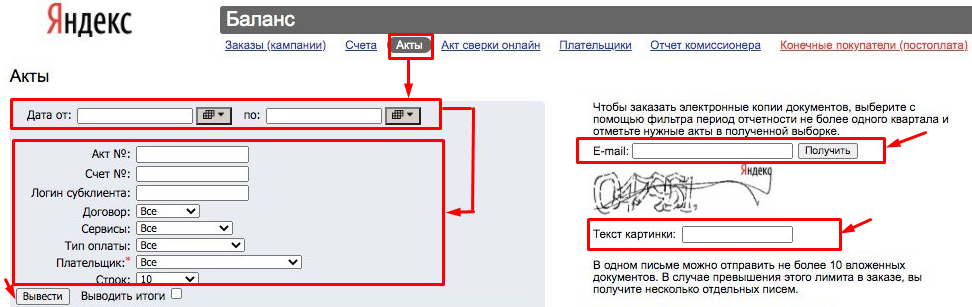 Заказ копий актов также осуществляется в Яндекс.Балансе на странице « Акты ». Копии документов отправляются на электронную почту.