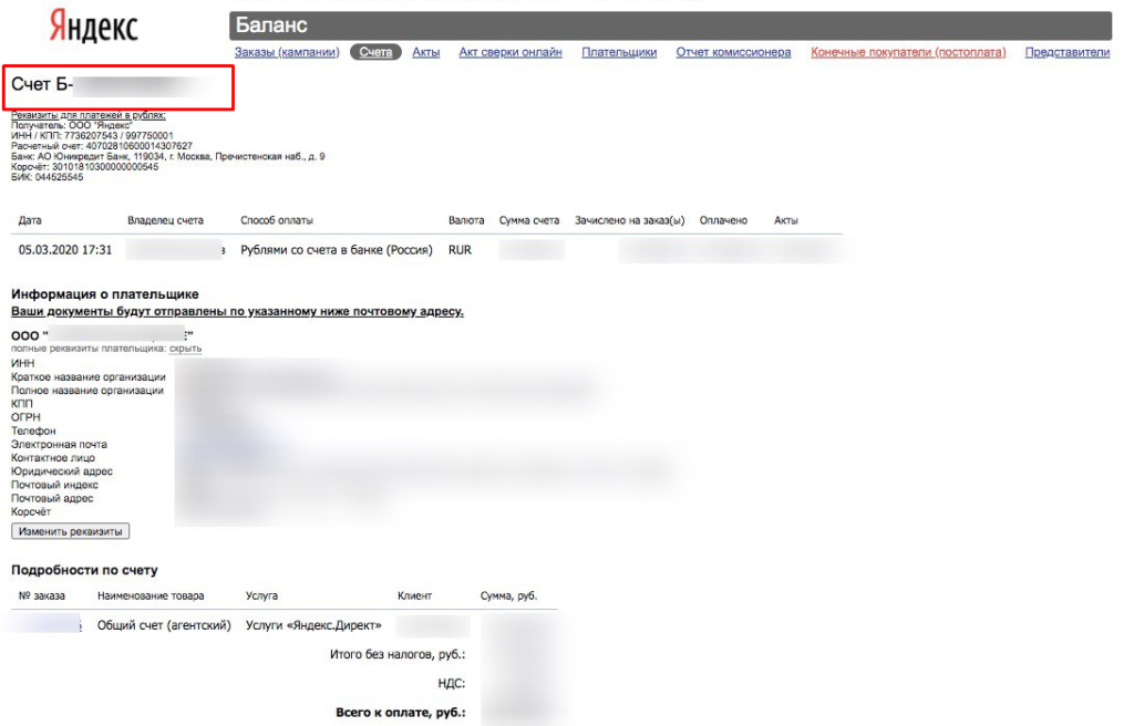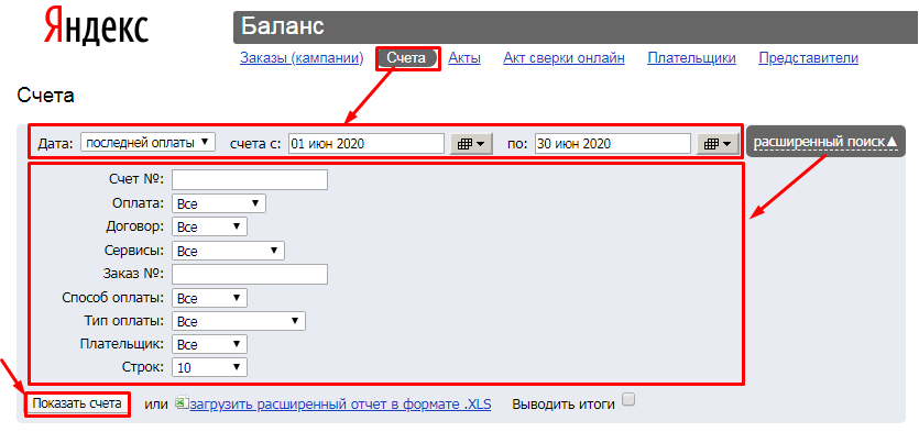 Вся история взаиморасчетов между рекламодателем и Яндексом хранится в Яндекс.Балансе. В своем кабинете вы можете не только находить счета и акты за определенное число, но и заказывать оригиналы документов вручную. Это нужно, например, в случае их утери бухгалтерией и других форс-мажорных обстоятельств.