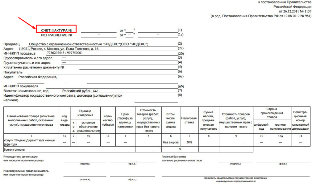 Обратите внимание, что номер и название рекламной кампании в акте и счете-фактуре не указываются