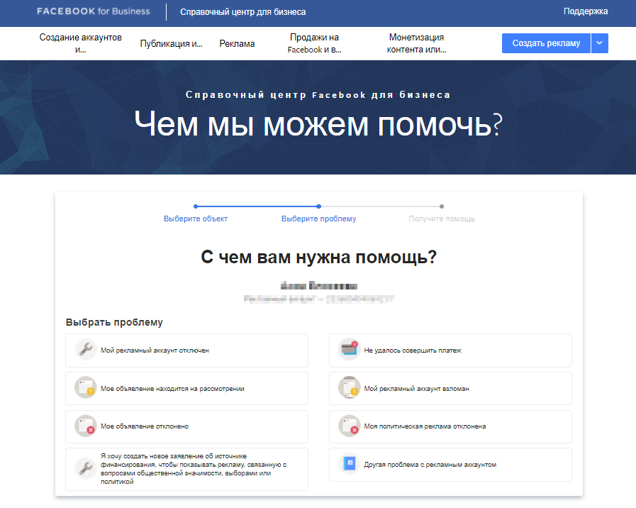 После этого необходимо выбрать проблему из предложенного, по которой вам нужна помощь, или выбрать вариант Другая проблема с рекламным аккаунтом.