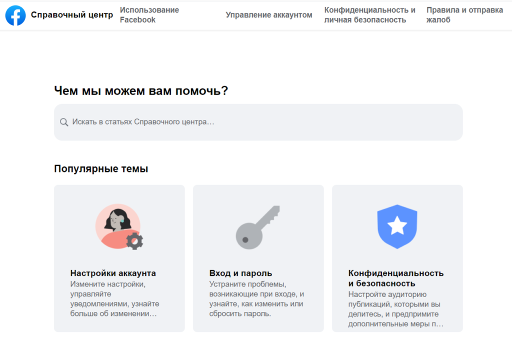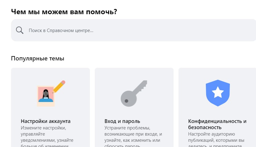 Также в меню поиска можно вбить интересующую вас тему, чтобы сразу перейти в нужный раздел фейсбуковской справки.