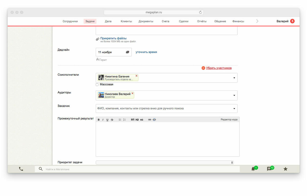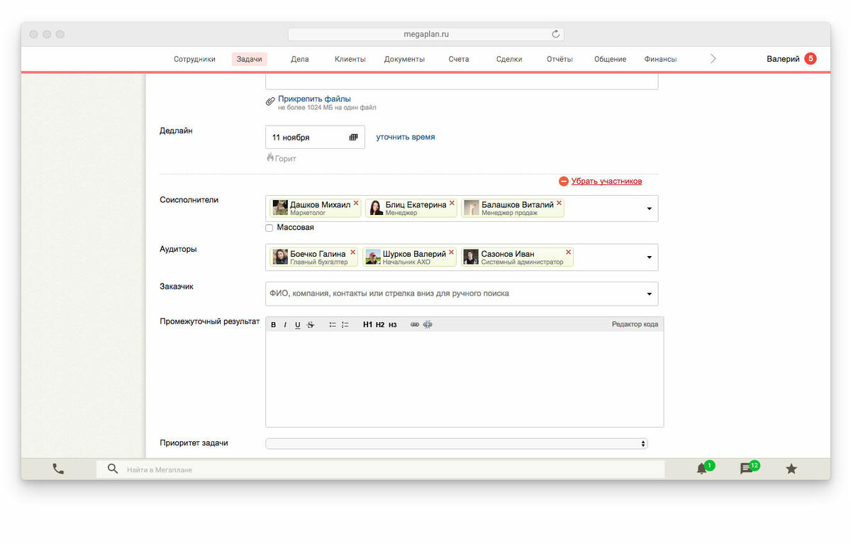 В задаче можно указать только одного ответственного, добавить соисполнителей и аудиторов, установить дедлайн. В нашем случае дедлайн устанавливаем на 11 ноября, добавляем в соисполнители кадрового специалиста. К задаче можно приложить неограниченное количество файлов и создать в карточке дополнительные поля, необходимые для работы и отчетов.