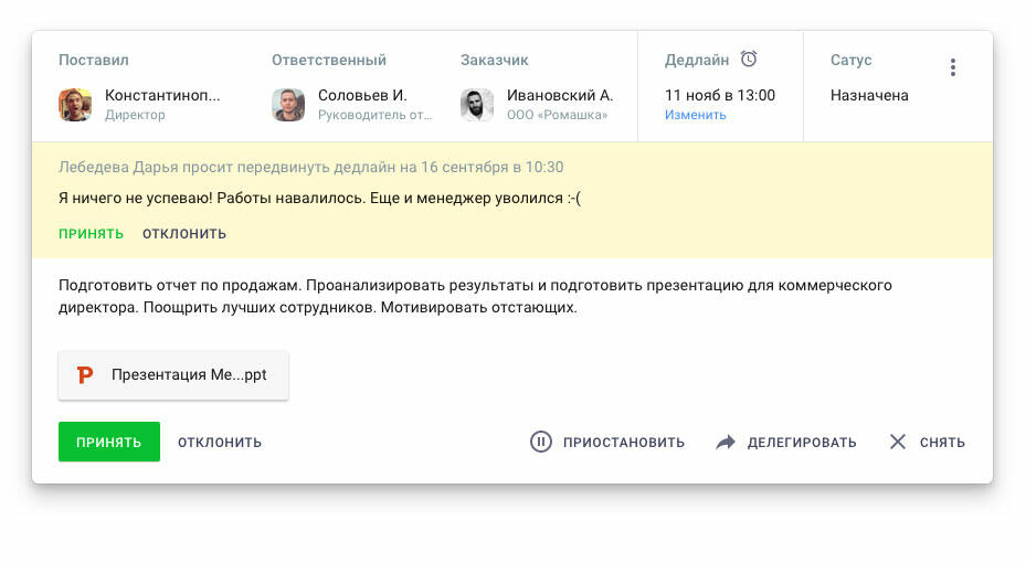 Когда задача поставлена, в единый центр уведомлений на панель информера, участникам придет уведомление, а исполнителям — запрос на новую задачу. Пропустить или игнорировать его очень сложно. Из информера сотрудники могут принять задачу или, объяснив причину, отклонить. В будущем задачу можно делегировать подчиненному, провалить, если она оказалась не по зубам, или поставить на паузу, если появились более важные проекты.