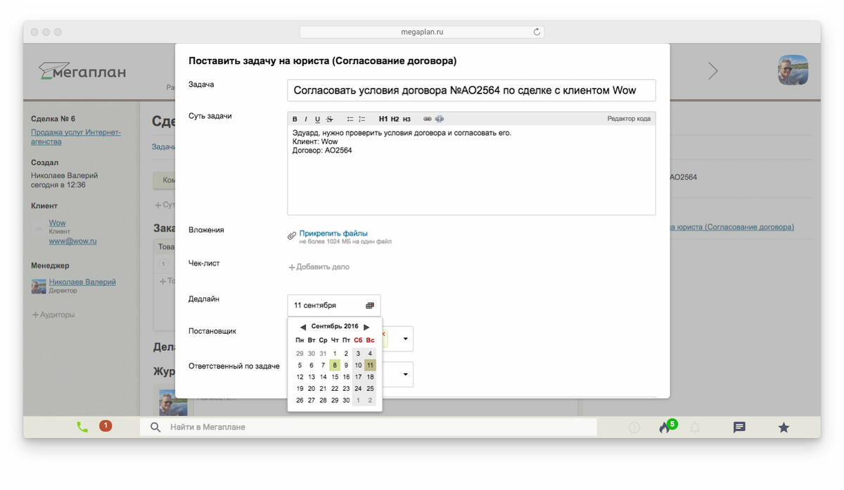 Мегаплан умеет автоматически ставить задачи в сделках. Но для этого нужно указать условие: допустим, переход сделки из одного статуса в другой. Как только сделка перейдет к этапу согласования договора, Мегаплан в зависимости от настроек сам поставит задачу юристу или предложит сделать это менеджеру.