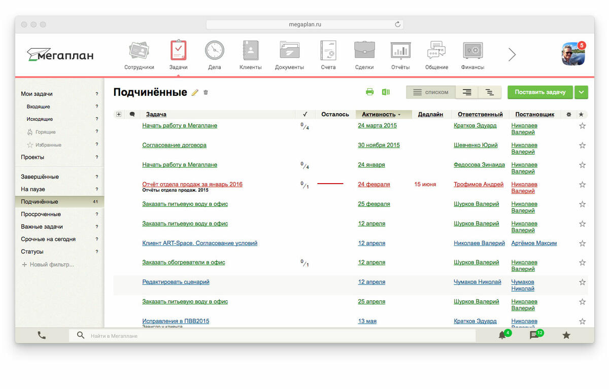 Чтобы посмотреть все задачи подчиненных, достаточно заглянуть в одноименную группу на панели фильтров в левой части Мегаплана. Если среди них есть те, по которым прошли сроки, они будут окрашены в красный цвет. Заглянув в задачу, вы сможете увидеть проблемы, узнать, кто виноват в задержке и когда ждать результат.