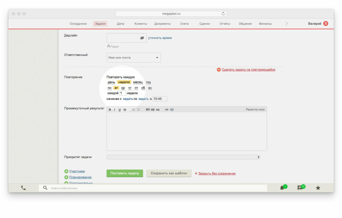 После этого задачу нужно поставить на повтор, выбрав день недели и время. Тогда Мегаплан с заданной периодичностью будет сам создавать новую задачу, подставляя нужные значения. Повторяющейся можно сделать любую задачу, но только в шаблонах доступны переменные.