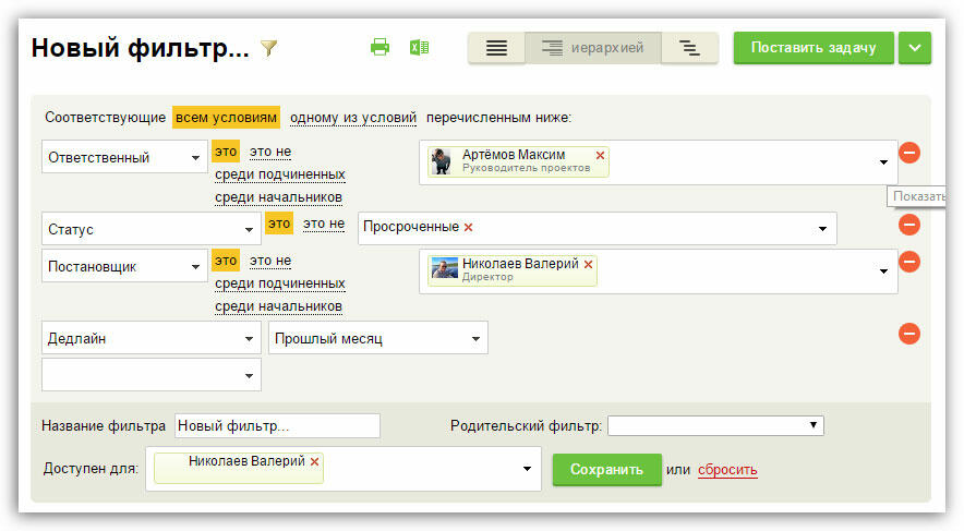 Если интересуют задачи конкретного сотрудника, можно настроить фильтр только для него. Фильтры можно редактировать, комбинируя нужные условия. Например, сотрудник просится в отпуск, а вы не знаете, можно ли его отпускать. Используя фильтр, можно оценить, сколько у него задач в работе, есть ли среди них просроченные, какова его роль в проектах.