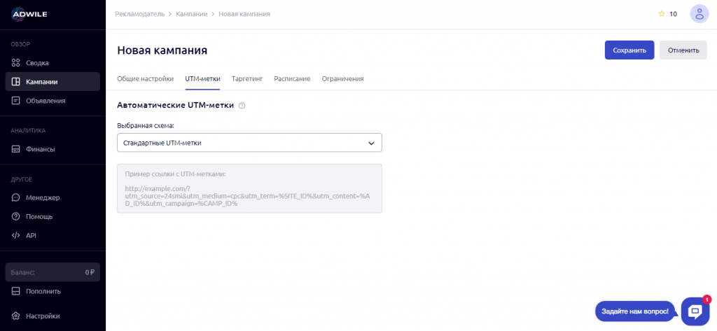 Дальше также ничего сложного — указываем необходимые UTM-метки (можно взять стандартные), необходимый таргетинг (тип устройств и ГЕО):