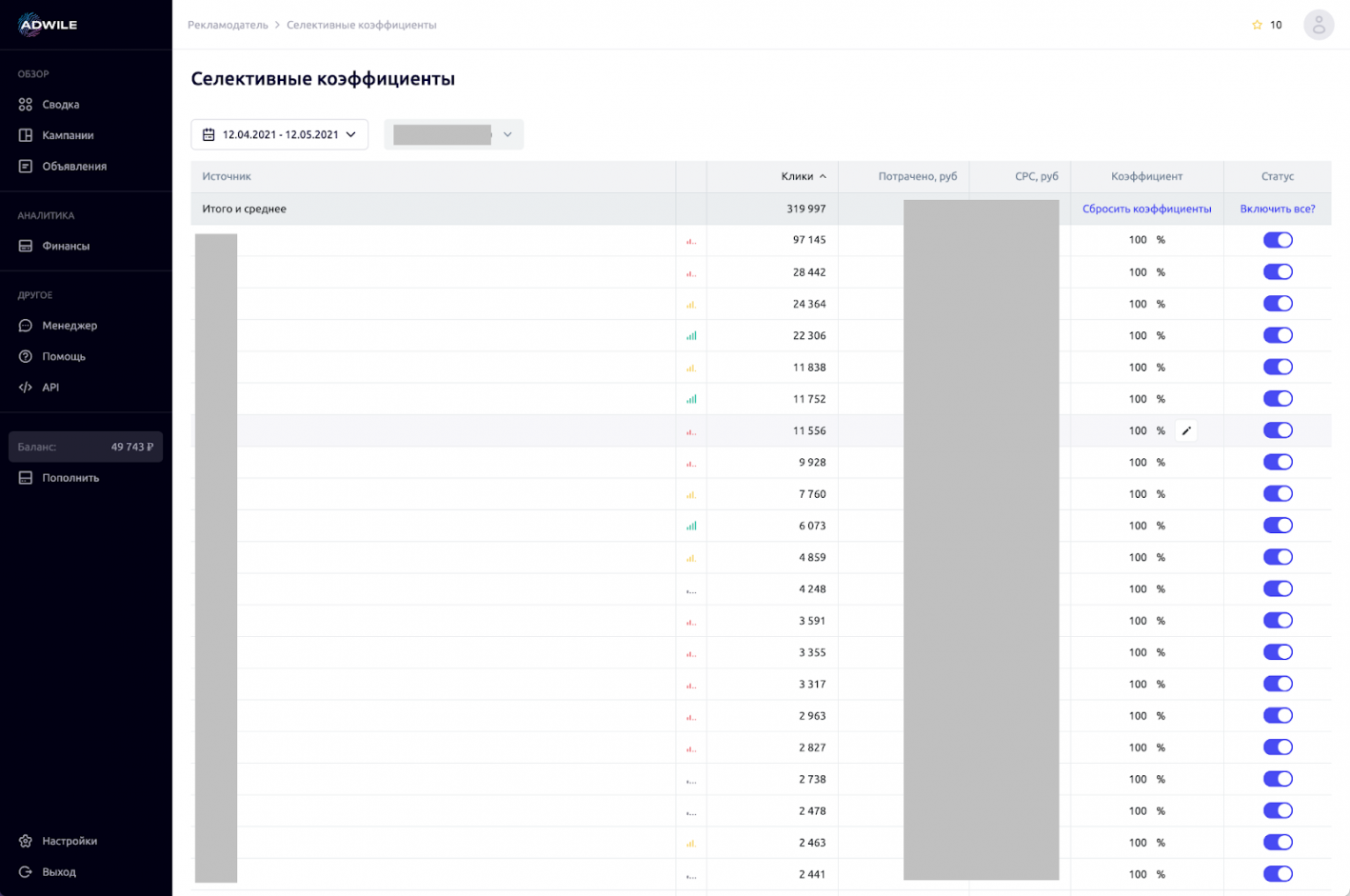 - Используйте комплексный подход — профитность площадки, поведенческие факторы и CTR площадки (имеет смысл банить РК с низким количеством кликов по отношению к числу показов).