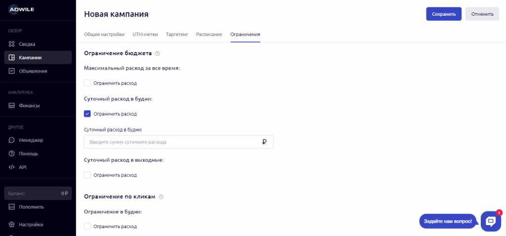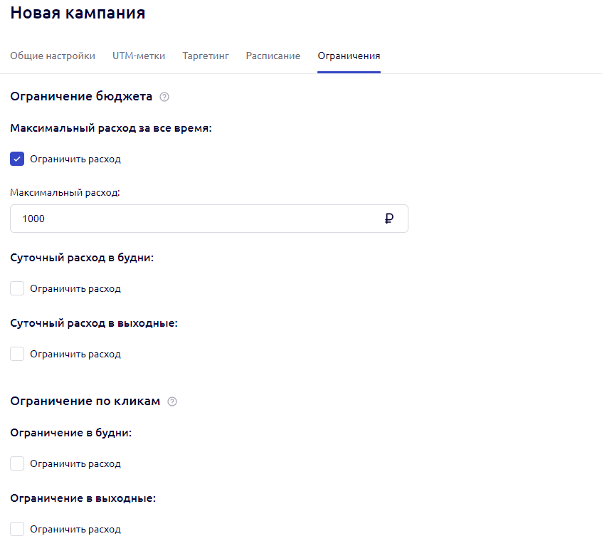И напоследок стоит заглянуть в разделы «Расписание», где, как ни странно, можно выставить расписание по дням недели и часам показов вашего рекламного объявления, и в «Ограничения», где можно отстроиться по лимитам расхода бюджета и количеству кликов.
