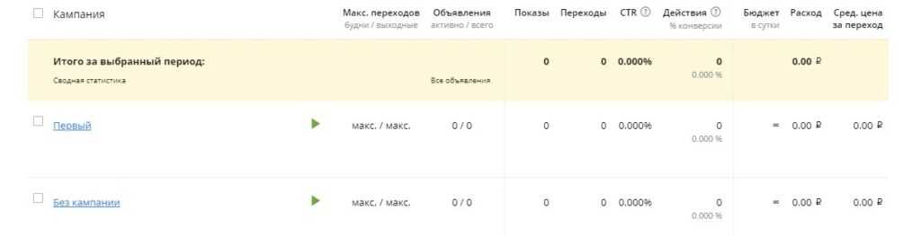 Отслеживать статистику по работе можно напрямую во вкладке кампании, здесь есть информация о CTR, показах, кликах каждого креатива.