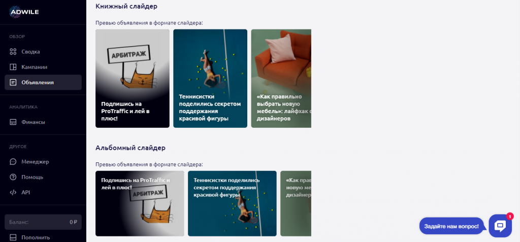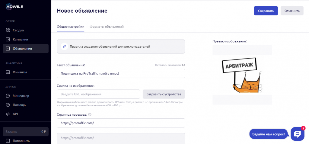 Далее кампанию сохраняем и идем в раздел объявлений, чтобы добавить наши баннеры. Как говорили в начале статьи, в рекламной сети под запретом реклама 18+ контента, а также гемблинг, трендинг. С остальным можно работать.