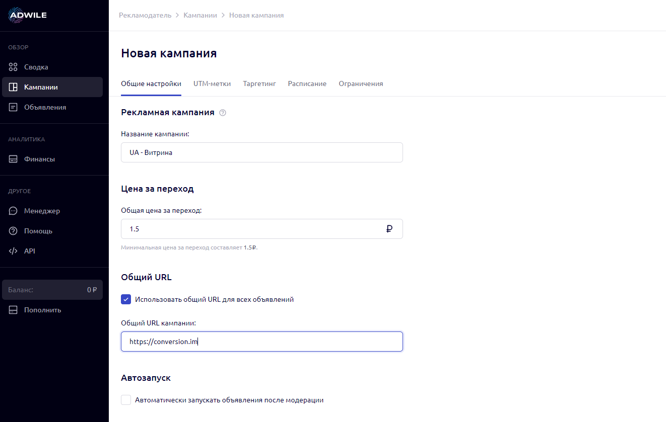 Переходим в раздел «Кампании», нажимаем создать новую кампанию, заполняем форму, где даем кампании название, выставляем цену перехода, вставляем ссылку на наш лендинг и ставим (или не ставим) галочку на автозапуск кампании после модерации.