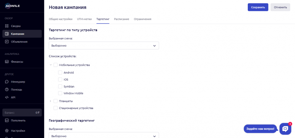 Дальше в раздел «Таргетинг», где можно отстроиться по устройствам, ОС и ГЕО.