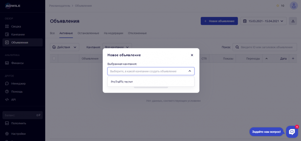 Нажимаем на «Создать новое объявление» и выбираем нашу созданную кампанию.