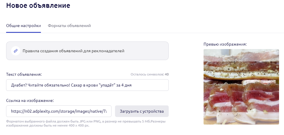 Дальше заполняем поля конструктора креатива. Также не помешает заглянуть в правила создания объявлений в сети Adwile.