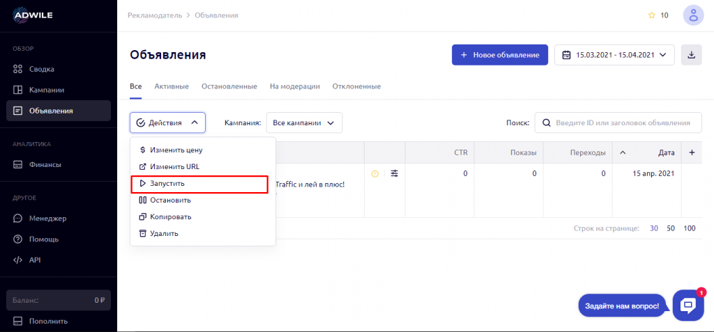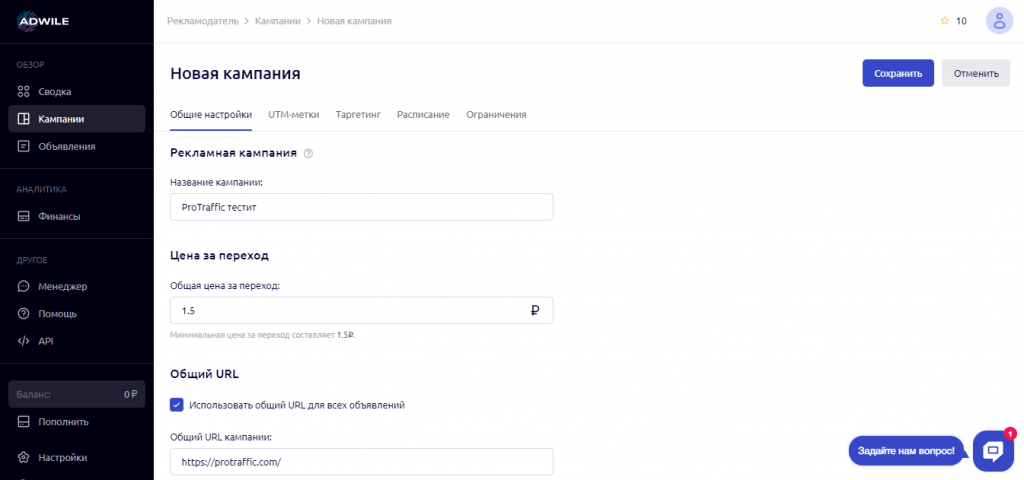 Регистрируемся в Adwile как рекламодатель и пополняем баланс (стоит отметить, что минималка всего 1000 рублей).