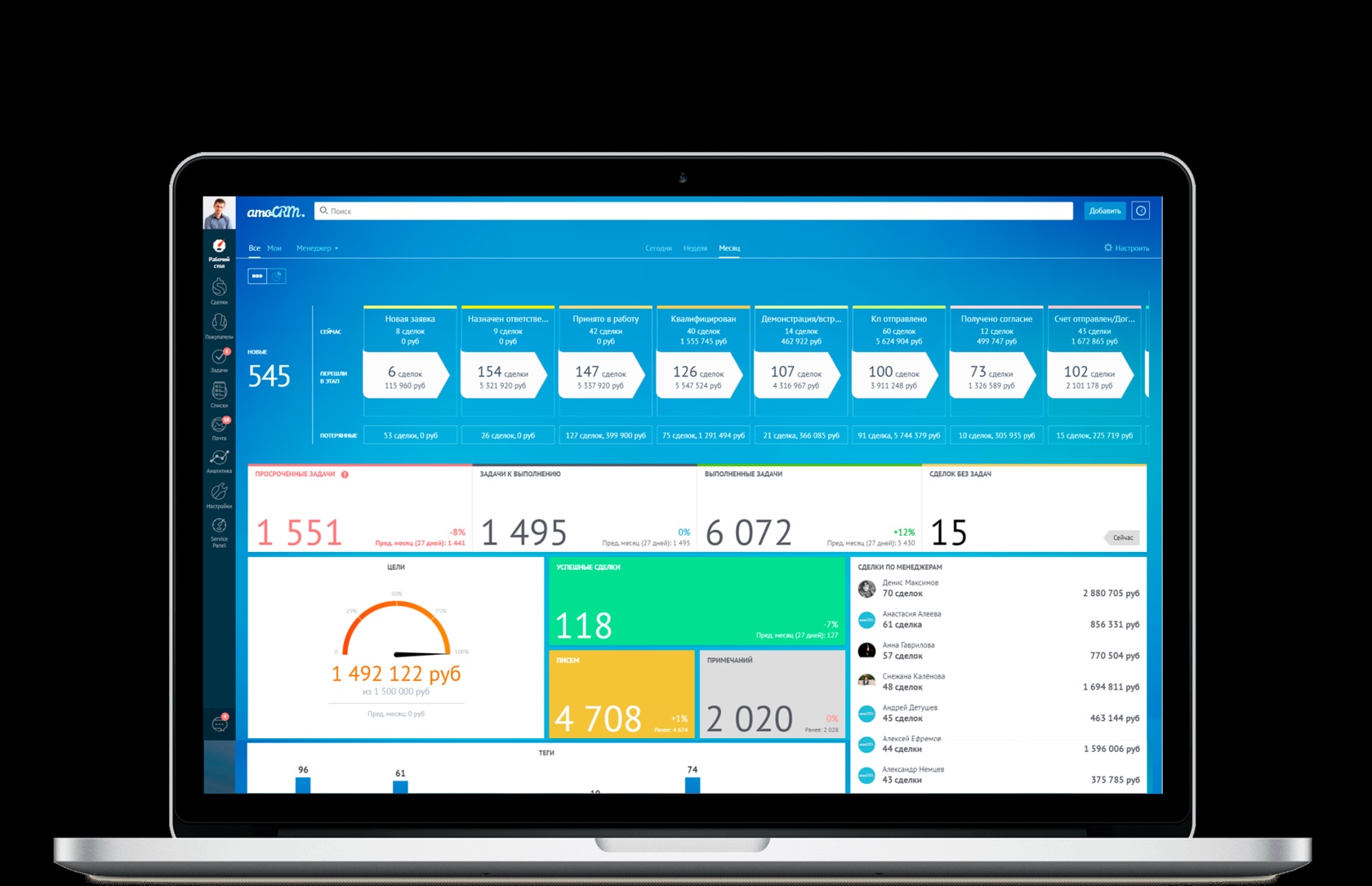 - Со стороны руководителя через систему осуществляется управление задачами отдела, например, контроль выполнения плана отдела продаж.
