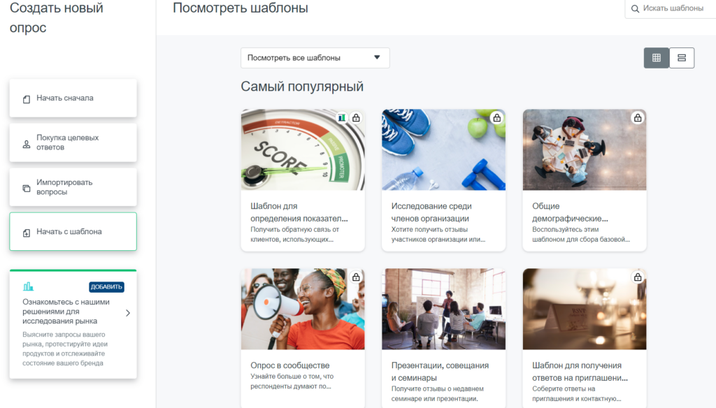 SurveyMonkey, с другой стороны, предлагает более 150 шаблонов. С такими опциями, как здравоохранение, исследование рынка и некоммерческие организации, вы обязательно найдете здесь. Как и в Google Forms, вы можете редактировать любой шаблон по вашему выбору. Тем не менее, так как вы можете выбирать из большого количества, вам может потребоваться лишь внести несколько изменений.